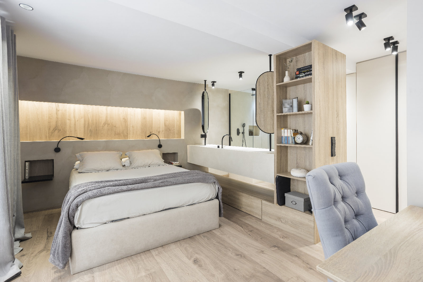 Transformar una sala diáfana en una suite privada manteniendo amplitud y luminosidad.